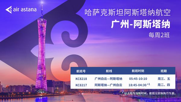 • 阿斯塔纳航空将开通广州—阿斯塔纳直飞航线