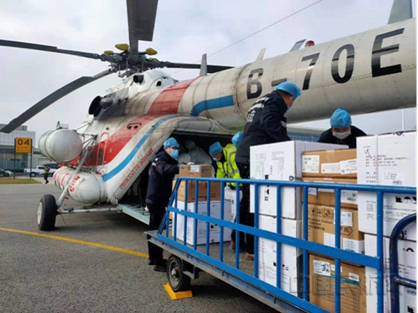 《中国民航报》、中国民航网 记者冯智君 通讯员黄早杰、周俊杰 报道: 2月12日,应湖北省应急厅请求,空军某部紧急出动2架某型直升机和湖北省应急厅2架民用米171直升机一起组成运输队,分别向湖北宜昌市、襄阳市空运9吨应急防疫物资。