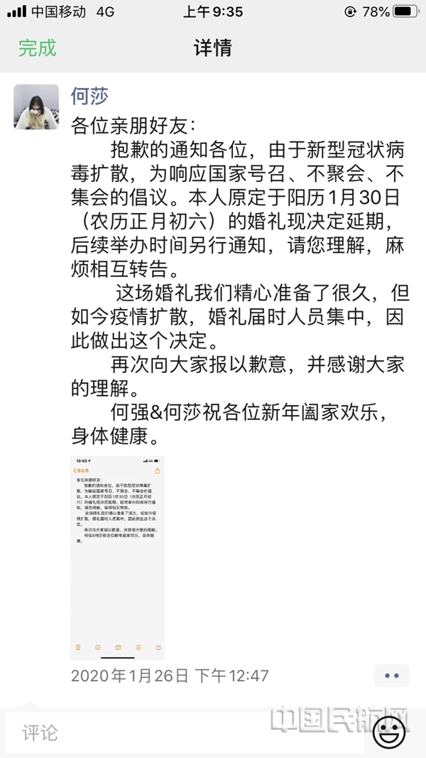 大年初二,航班保障师何莎在朋友圈发布了原定于1月30日的婚礼推迟的消息。