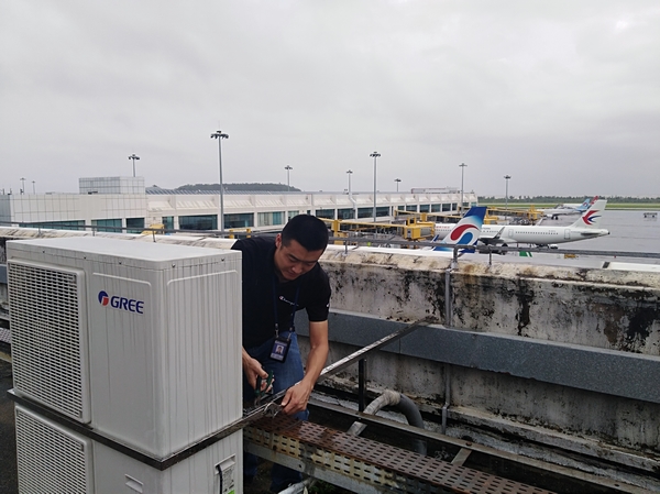 后勤保障人员在加固空调