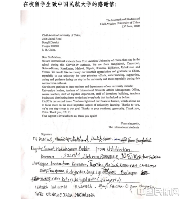 2020年6月,学校来自10个国家的25名在校留学生自发组织书写联名感谢信,表达了对中国、学校领导、各部门老师和辅导员的感谢之情
