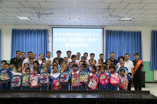 中国民航网 通讯员李逸 报道:"民族团结一家亲,爱让我们在一起。"6月7日,且末玉都机场与且末县巴格艾日克乡小学开展"民族团结一家亲"暨献爱心活动。且末机场玉缘班组12名班组成员精心策划,细心准备,为孩子们送去了书包、文具、体育用品等爱心礼物,与同学们做游戏、谈理想、比才艺、学维语,爱心飘洒,情融一家。