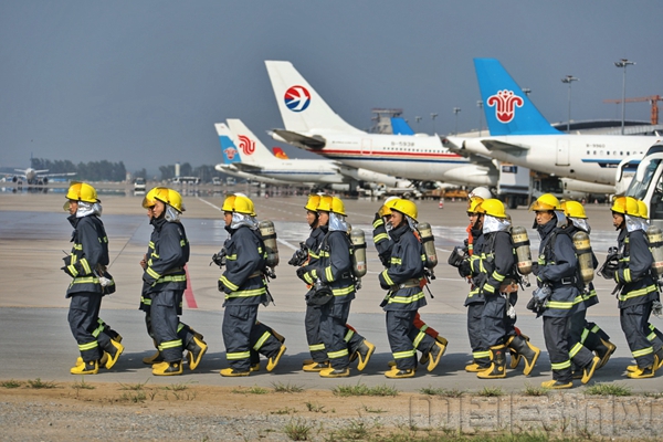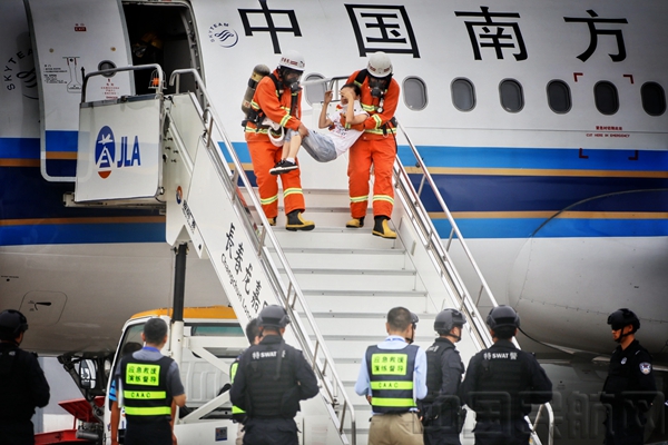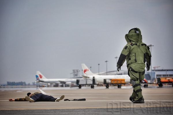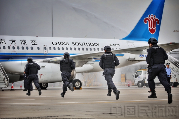 中国民航网 通讯员王恩鹏、唐青昆 报道:8月1日上午9时30分,伴随着"各单位请注意,各单位请注意,AA3456航班空中遭两名男子持疑似爆炸物劫持,预计50分钟后降落....."的急促报告声,拉开了长春机场2017年"砺剑-6号"反劫机应急综合演练的序幕。