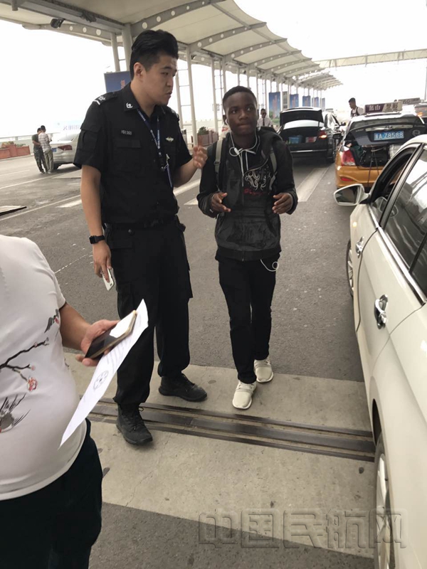 此时,安检值班队长贾雪峰第一时间赶来,了解情况后,便向小伙所在学校拨打了联系电话。由于时间刚好中午,电话并没人接听。几经辗转后两人决定,为这名非洲小伙叫来一辆滴滴快车,送他上车并提前为其支付了费用。期间,贾雪峰叮嘱司机将小伙子送到学校门口联系工作人员,并与机场安检回电确认。