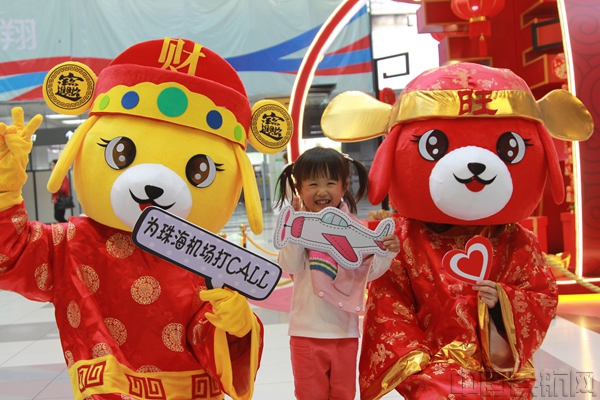 “我在珠海机场等你”“为爱回家快乐飞翔”“世界那么大,我想回家看看”“累了就回家吧”“日记我写不来,可我心里全是你”……不同主题的拍照框成为了旅客们争相拍照留念的对象。备受欢迎的拍照“模特”,还有由机场工作人员装扮的“狗狗公仔”。