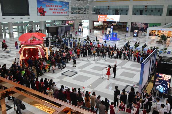 10时许,机场出发大厅内突然响起了《快乐出发》那欢快的乐曲声,一群身穿南航制服洋溢着青春气息的女青年突然闪现,她们伴着曲声跳起了热舞,吸引了大批匆匆出行旅客的眼球。原来,以“阳光南航,情暖回家路”为主题的文艺快闪登场了。热舞很快结束,围观的旅客尚未尽兴,大厅内缓缓响起了悠扬的萨克斯演奏曲《鸿雁》,3名南航专业舞蹈演员翩翩起舞,引来大批陆续走进机场出发大厅旅客的围观。《鸿雁》刚谢幕,随即响起快板《飞向新征程》。节奏欢快、诙谐幽默的快板博得现场旅客阵阵喝彩。最后,身着南航制服的工作人员出现在机场候机楼三楼,大家在意味深长的《共筑中国梦》乐曲声中载歌载舞……