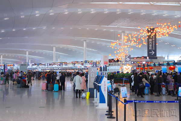 大红的灯笼、福字、年画……T2航站楼大门、问询、值机、安检、候机,目光所及,到处是浓浓的年味。在三楼国内出发大厅中央,365只“福禄家春”年灯仿佛从地面缓缓飞向天空,流光溢彩、蜿蜒致远,承载着归家的心愿,让南来北往的旅客感受中国年的独特韵味。国内、国际出发隔离区自动步道的迎春拱门上,万树梅花、千门福字、百样诗情,让准备登机的旅客感受春的气息。