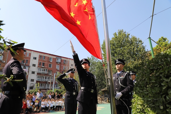 中国民航网讯:9月2日,在新中国成立70周年的入园“开学第一课”上,首都机场公安局选派18名青年民警走进首都机场幼儿园,为在五星红旗的陪伴下、与祖国共同成长起来的新一代,用最庄严的仪式“共升一面旗,同唱一首歌”,带来一堂恰逢其时的“开学第一课”,培养孩子们对国家和中华民族的认同感、归属感、自豪感。