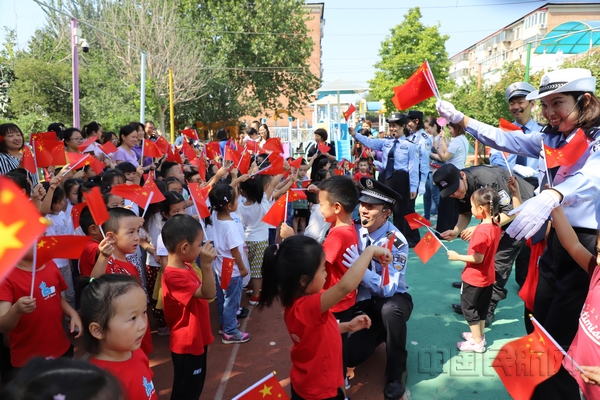 活动现场气氛热烈,在庄严的升旗仪式之后,青年民警们带领小朋友们一同挥舞起手中的国旗,同唱《国旗国旗多美丽》、《歌唱祖国》、《我和我的祖国》等爱国歌曲,引领在国旗下茁壮成长的孩子们,用歌声诉说生长在五星红旗下的幸福与自豪,生发“我与祖国共成长”的美好心愿。