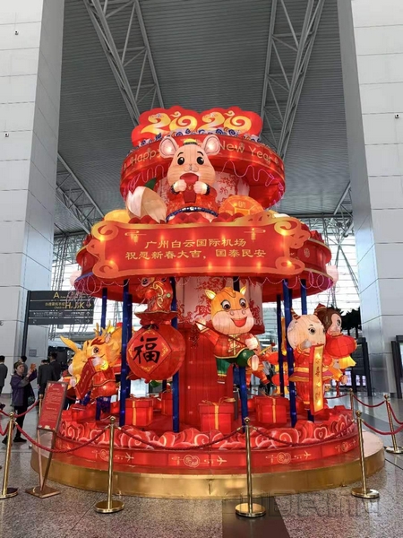 机场“花街”店铺共有11个,铺面布置意念源自岭南特色建筑,以红色和金黄色为主色调,寓意喜庆和团圆。每个店铺档口仿岭南建筑特色,装饰有“雕刻”的“琉璃瓦当”、挂红彤彤的仿古灯笼。花街中间有两盏巨大的花灯,一组是醒狮献瑞,另一组是十二生肖团圆贺年。中国彩灯,饮誉古今;自贡灯饰,更被奉为“高品位”的艺术。这两个灯组,是请四川自贡的传统艺人手工打造,力求把最纯粹的中国元素,最热烈喜庆的中国年,呈现给来自全世界的旅客朋友们,带来更美好的出行体验。