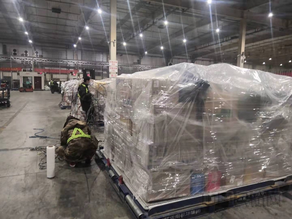 河南省机场集团货运公司员工在郑州机场西货站为防控物质打板。