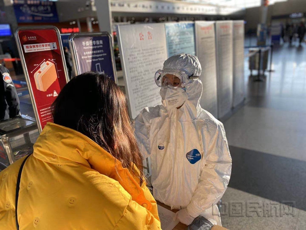在航站楼临时休息室见到了他,正捧着午餐狼吐虎咽,匆匆几句话又奔赴岗位,原来是因为刚刚落地的航班上旅客人数较多,要做到所有旅客体温监测,双人保障稍显困难,临时调派增加岗位人员,所以他的午饭时间仅仅只有三分钟,后来他告诉我:“第一次穿隔离服,就捂的全身大汗,护目镜全是水,才体会到一线医护人员原来是在这样的高温和压力下工作的,奋战在武汉的那些医护人员真的很了不起,我也会以党员的标准来严格要求自己,向他们看齐。”