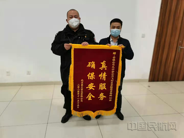 中国民航网通讯员李紫剑报道:12月1日,北京赛文货运有限公司员工来到北京大兴国际机场货运站,为首都机场安保公司大兴机场分公司飞行区安检部送来一面印有“真情服务,确保安全”的锦旗。