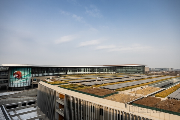 大兴机场停车楼建筑总面积约25万平方米、车位4228个。从停车楼规划之初,大兴机场就遵循“平安、绿色、智慧、人文”的四型机场建设要求,将安全运营、绿色发展与创新创效深入到停车楼建设标准体系之中。2018年9月,大兴机场会同驿停车启动了光伏发电项目的投建工作。该项目位于P1、P2两幢停车楼屋顶,由23832块光伏薄膜组件构成,总面积约1.8万平方米,总装机容量为2.8MW(兆瓦)。考虑到用电经济性及并网安全,整个发电系统分成了若干个子系统,每个子系统太阳能光伏发电电力经直流汇流-逆变-交流汇流后,并入项目380V母线,最终实现了所发电量自发自用,多余电量送入当地配电网。380V的低压接入,保证了系统运行的安全性与稳定性,同时也降低了停车楼日常运营及维护的风险。