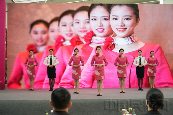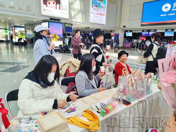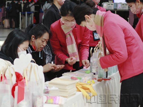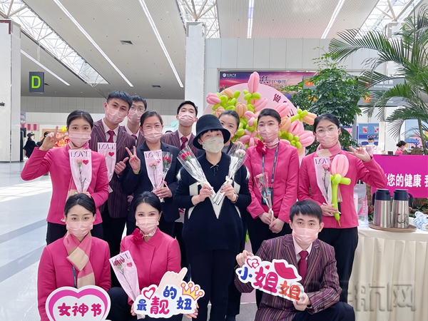 今天,候机楼内精心布置了形式丰富的主题服务提升活动。在值机大厅,工作人员为往来的女性乘客送上芳香的康乃馨,以此表达节日的美好祝愿。
