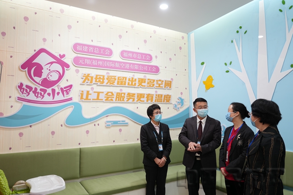 启动仪式结束后,省、市总工会领导一行来到候机室的“妈妈小屋”查看慰问。福州机场共设立24间“妈妈小屋”,用于满足女性孕期休息、哺乳期哺喂、多孩同行、独自带娃出行等多重需求。