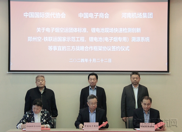 《中国民航报》、中国民航网 记者冯智君 通讯员蔡梦云 报道:10月22日,河南机场集团与中国电子商会、中国国际货代协会在郑州机场签署关于电子烟空运团体标准、锂电池现场快速检测创新、郑州空—铁联运国家示范工程、锂电池(电子烟专用)溯源系统等事宜的三方战略合作框架协议,此次签约将充分发挥郑州机场航空物流大通道优势,跨境电商带电货物航空运输及空铁联运将更加方便快捷,助推郑州航空枢纽发展能级实现新跃升。