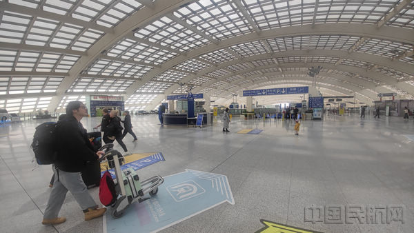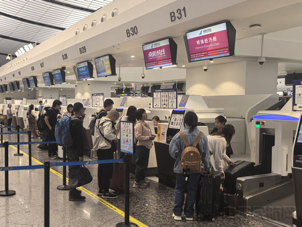 旅客在大兴机场航站楼值机柜台前办理值机手续(杨函泽/摄)