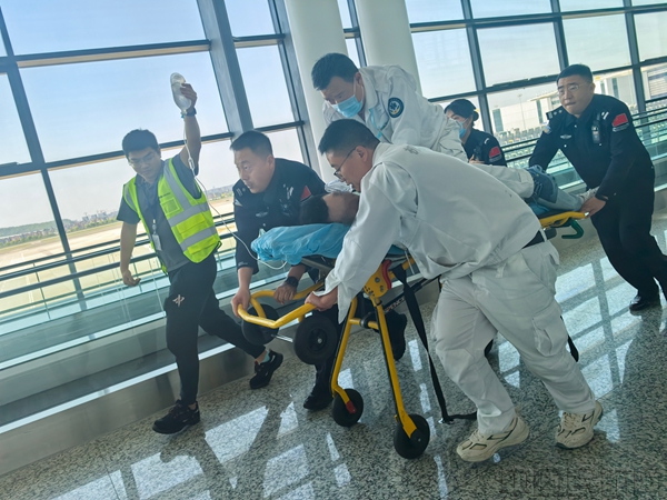 14:11,旅客被转移至担架车,机场边检、地勤人员迅速协助转运。医务人员轮番跪立于担架车实施胸外按压,保持每分钟100-120次的按压频率与5-6厘米的按压深度。运送途中,担架车在航站楼内快速穿行。