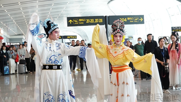 中午客流高峰时段,悠扬的东河戏唱腔在机场大厅骤然响起,国家级非遗传承人携经典曲目惊艳亮相,让旅客近距离感受戏曲艺术的魅力。