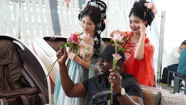 活动在一首《上春山》中拉开序幕,身着传统服饰的工作人员为旅客赠送鲜花与祝福,在“赠您一枝春,愿君常安顺”的祝福声中,花香与笑脸交织,展现赣州客家人的热情好客。