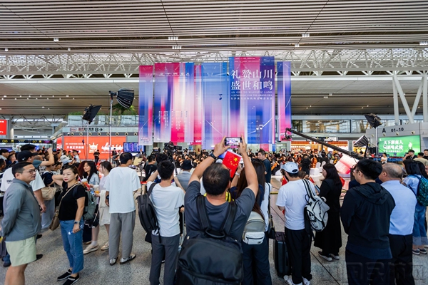 随着《歌唱祖国》旋律响起,现场的氛围被再一次点燃,全场观众齐唱“歌唱我们亲爱的祖国,从今走向繁荣富强!”,候机楼内五星红旗在人群中轻轻摇曳,宛如一片波澜壮阔的红色海洋,现场的旅客、工作人员自发地和歌手共同合唱,每个人脸上写满了幸福与自豪。带着孩子候机的李女士感慨道“很幸运能在机场遇到这么高水准的音乐会,让孩子在旅途中接受了一次生动的爱国主义教育,期待未来像这样的活动能多多举办!”
