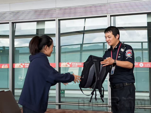 “本以为暑运高峰安检都在忙安全检查,我这丢了存着重要工作录音的耳机,找回来肯定难了,没想到你们不仅很快找到,还贴心帮我送回!”昆明机场安检现场,尚女士专程送来一面印着“安检尽职速寻物 空港服务暖如光”的锦旗,握着安检员的手反复道谢。