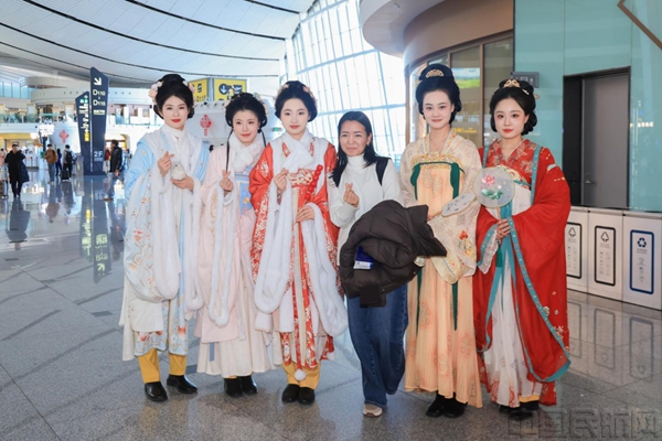 艺术家们以一场中西合璧的听觉盛宴,为过往旅客奉上新年贺礼。弦乐四重奏《卡农》的经典复调与《茉莉花》的东方婉转交织回响,压轴曲目《我和我的祖国》旋律一起,瞬间激发现场旅客的家国情怀。演出创新融入诗朗诵环节,将“以文载道”的文学意境与美妙音乐交相融合,化旅客匆匆步履为诗意驻足。不少旅客拿出手机记录下这份旅途中的“意外之喜”,在悠扬的乐声中辞别旧岁、喜迎新年。大兴机场同步推出国风华裳主题巡游,身着传统服饰的员工步履轻盈穿梭航站楼,与旅客沉浸式互动送福;更备有新年定制好礼倾情相赠,让旅客在出行途中收获双重惊喜,沉浸式感受传统年味与空港温情。