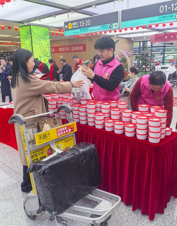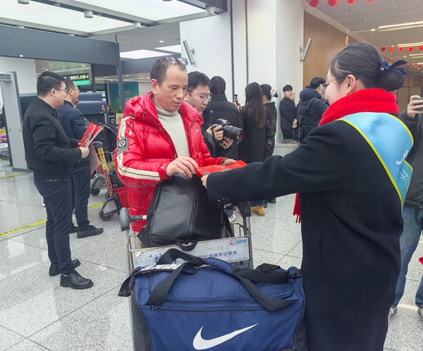 此外,为迎接浙江籍侨胞春节返乡,杭州机场还准备了一系列特色温馨的服务。旅客一落地,机场客运站就有专门的接送机引导服务,由于侨胞的大件行李很多,工作人员在引导的同时也会帮助侨胞旅客推送行李到客运中心进行安检。在完成行李安检后,在等候区会送上春联、福字等纪念品。上了大巴车后,车上还会提供春节特色大礼包,让侨胞旅客在杭州就有回家过年的氛围感。与往年不同的是,今年在以往的特色基础上,在候车厅里,书法家现场为侨胞书写并赠送春联、“福”字,工作人员为侨胞旅客奉上一碗热乎乎的腊八粥。候车的时候,侨胞旅客还可以体验拓印制作等简短的非遗项目,在“祝福墙”或“许愿树”上,写下新年寄语祝福,并在“国门同框”合影区打卡留念。让归乡返程的旅途更加丰富多彩。