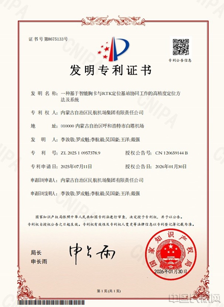 中国民航网 通讯员李航毅、吴国豪 报道:近日,由锡林浩特机场职工自主创新研发的“防跑道侵入监控预警系统”(称“STOP监控预警系统”)正式取得国家知识产权局授予的发明专利证书。这一成果标志着锡林浩特机场在智慧机场建设领域实现核心技术突破,为支线机场安全管理数字化、智能化转型提供了可复制、可推广的实践样本。