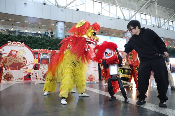 9时30分,2号航站楼主会场的北方舞狮表演率先拉开活动序幕。威武的雄狮伴随铿锵锣鼓翻腾跳跃,刚劲有力的动作融合武术与杂技元素,将民俗文化的精气神展现得淋漓尽致,瞬间点燃现场气氛,不少旅客驻足鼓掌,用镜头记录下这份国门年味。舞狮表演落幕,AI机器人紧随登场,随着欢快旋律跳起整齐划一的舞蹈,憨态可掬的动作与科技感十足的表现形成奇妙呼应,传统年俗与前沿科技的碰撞,让现场欢笑不断。