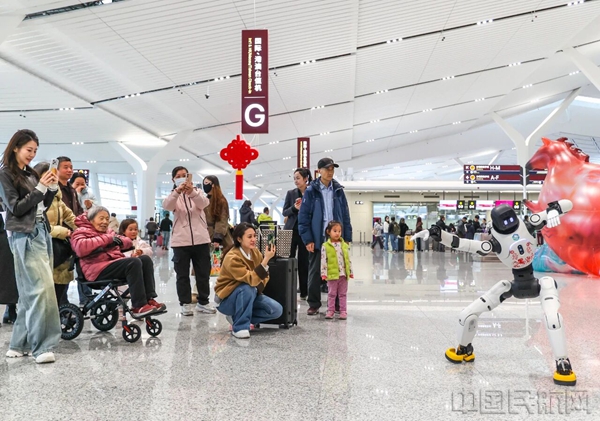 中国民航网 通讯员李宜鹏、陈雨格 报道:三月芳菲,花“漾”绽放。在“三八”国际劳动妇女节来临之际,西安咸阳机场携手科技公司,在T5航站楼温情开启 “智献芳华・春日鲜花派送” 主题活动。活动以“科技互动+温情礼遇”为核心,深度融合科技元素与人文关怀,人形机器人化身节日惊喜主角,不仅带来风格多样的舞蹈表演,还主动邀请旅客参与诗词互动,送上专属暖心祝福与鲜花。