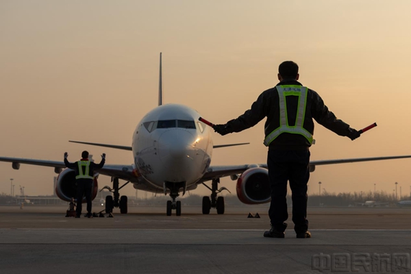 3月13日7时,工作人员正在指挥载运瓶鼻海豚的中州航空波音737-800F货机滑行至指定机位