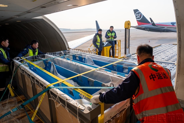 活体海豚运输对环境、时效及操作精度要求极高。运输过程中,海豚被安置于专用敞开式水箱内,身体缠裹保湿绷带并保持固定姿势,以降低应激反应。飞机抵达后,机场保障团队第一时间为海豚补水降温并监测健康状况,严格执行特种货物操作规范。从舱门开启到完成卸机仅用时11分钟,大幅压缩了海豚在机场的停留时间,有效降低了应激风险。