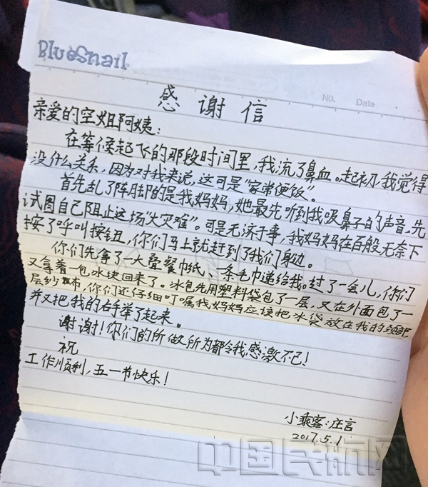 下客时,这位小朋友红着小脸跑到登机门,小心翼翼将手里的一张纸递给了乘务长张若兰,年轻妈妈认真诚恳的告诉乘务长说:这是她儿子特意写给乘务组的感谢信。年轻的母亲还提出另外一个请求,希望能与乘务组合影,让她儿子记住这些曾经帮助过他的人。