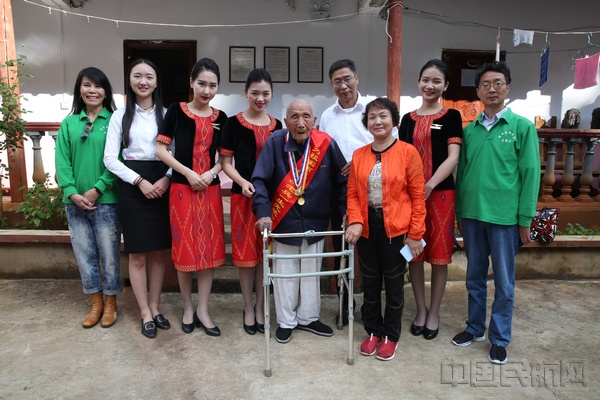 瑞丽航空党委副书记杜添华向98岁的中国远征军徐金堂赠送礼品