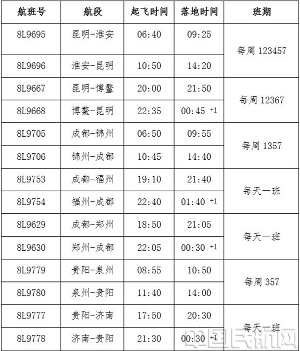 10月29日为2017/2018年冬春航季的第一天,祥鹏航空开通“昆明=淮安”、“成都=锦州”、“贵阳=泉州”等九条国内航线,具体航班信息详见下表。