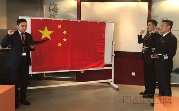 “我志愿投身北京首都航空有限公司飞行事业,坚持安全第一,刻苦钻研技术,严格执行飞行规章,坚决遵守飞行纪律,永远忠于机长职责,为北京首都航空有限公司争光……”首都航空的新机长王宁、李昊澄等人在程赛赛教员带领下面对国旗进行庄严宣誓。