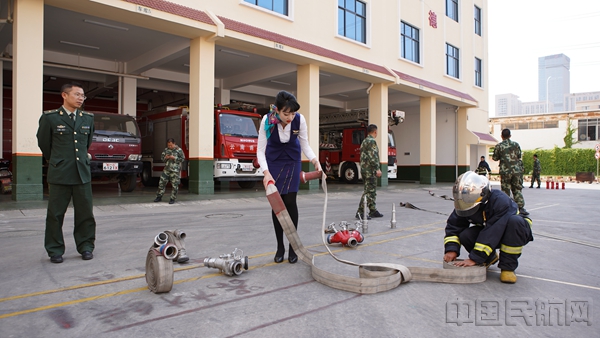 对于空乘来说,保障航班安全也是乘务员们的首要责任。在日常培训考核中,失火处置、灭火程序也是乘务员们的必备技能。通过交流学习,消防官兵们带领“阿诗玛”乘务组演练了灭火器的使用、锂电池失火处置等,让消防和空乘通过技能交流增进了解,共筑安全理念。