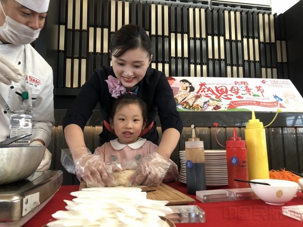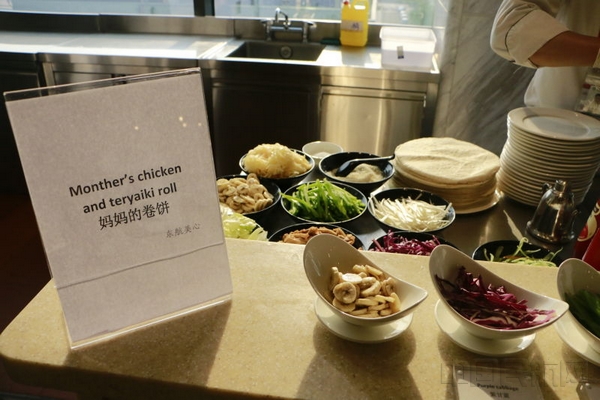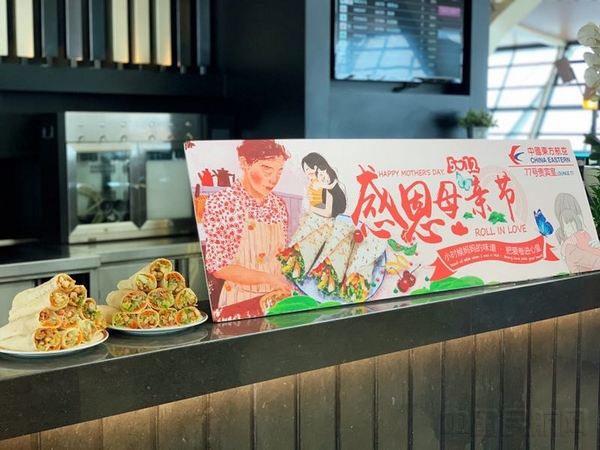 “还记得小时候吃过的卷饼嘛,那是亲情的味道,更是妈妈的味道”。贵宾室与东航美心精心准备了母亲节特供餐食,在铁板上备着胡萝卜丝、土豆丝、黄瓜丝、京葱丝、生菜、紫甘蓝、鸡肉、照烧酱、番茄酱、蛋黄酱可供旅客自助选取,厨师现场制作卷饼,各种佐料被包裹进面饼,犹如与妈妈紧紧相拥,把爱卷进心里,一份简单的特色餐食承载着东航员工对母亲深深的思念与祝福。一些小朋友也忍不住亲手试卷饼并送给妈妈享用。