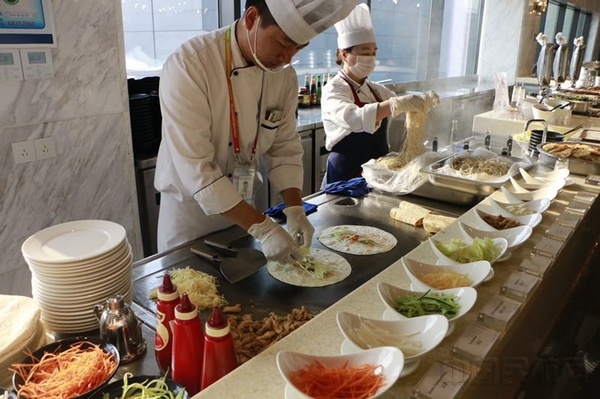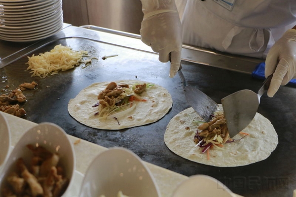 厨师正在为旅客精心制作妈妈的卷饼,努力还原小时候妈妈的味道。(吴旭东/摄)