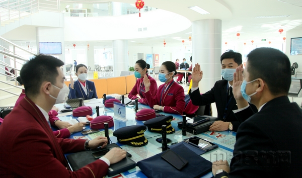中国民航网 通讯员张思维、王丹旎 报道:“我是本次航班的乘务长杨晓慧,我是一名共产党员,组里的其他党员同志请举手。”乘务组中有三名党员举起了右手,杨晓慧看着他们说:“亮身份、树标杆、做表率,现在执行航班任务,就是冲在疫情阻击战的一线,大家做好自我防护,我们4名共产党员更要积极发挥先锋模范作用,带头做好旅客服务和疫情防护工作。”