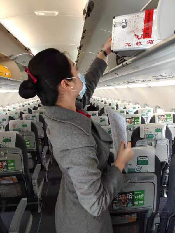 红航乘务员在航前检查机上急救箱