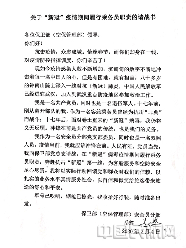 作为一名老党员,一名退伍军人,十七年前,刚刚退伍的岳辉作为一名客舱乘务员曾经为抗击“非典”战斗一线;十七年后,面对“新冠”病毒,又主动请缨冲锋在前,以实际行动回馈党组织的培养,在非常时期,更是用一名共产党员的初心和使命诠释着责任与担当。“人民有难,党员当先。军号已吹响,钢枪已擦亮,我收拾好行装,随时准备出发,冲锋在前.......”,岳辉面对新冠疫情时在请战书中这样写道。在他请战书的感召下,东航安徽广大空保队员纷纷表示面对疫情,绝不退缩半步,立足本职工作,严守空防底线,让党旗在民航疫情防控主战场高高飘扬,让党徽在空防安全第一线闪闪发光。