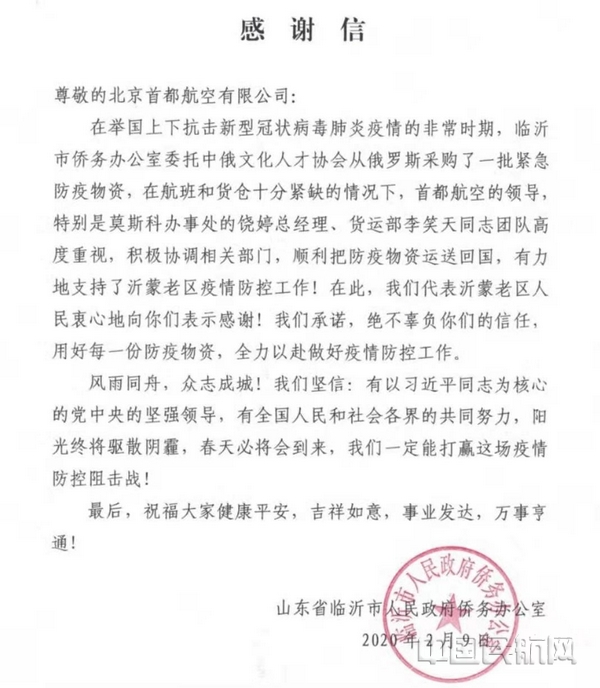 1月28日,首都航空莫斯科办事处饶婷接到俄罗斯华人商会救援物资运输紧急需求后,在4小时内,冒着大雪,带领地面工作人员完成2吨物资的装机起运工作。临沂市人民政府侨务办公室发来感谢信,代表沂蒙老区为首都航空无偿运输支援抗疫的行为点赞。