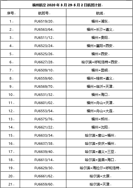 在航班恢复方面,按照民航局统一部署,3月29日-5月2日期间,福州航空将延续2019/20冬春季航班时刻,目前航班均已开始销售。具体航班恢复情况如下: