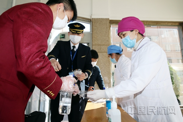 王淑慧为执飞航班的机组人员消毒。王有勉 摄