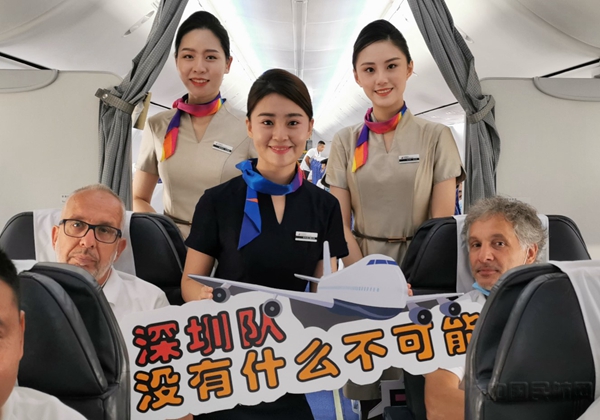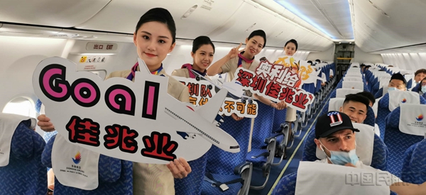 执行此次航班保障任务的机组成员们为球队举行了欢迎仪式,航班机长在广播中为球队送上了真挚祝福,表达了同在深圳基地的东海航空对佳兆业队的支持,为即将开始的中超联赛加油助威。
