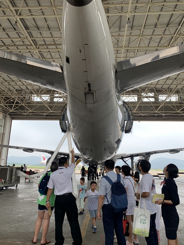 “原来飞机和人一样也要定期做体检啊?”机库中的一架空客320正在做定检,东航技术公司江西分公司定检车间的机务工程师带着小朋友在机库近距离观看飞机的发动机等中枢结构,机务工程师向孩子们介绍飞机的内部构造,各系统原理。孩子们看着发动机内部密布着的各类精密的管线,发出赞叹。“小朋友们,你们看看飞机的机翼有什么变化?”机务工程师操作舵面让孩子们从地面观察飞机起飞时机翼是如何变动?孩子兴奋的眼睛跟着机翼上下摆动。