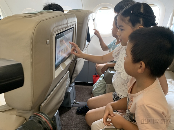 小朋友在飞机上使用公务舱娱乐设施 (摄:张志琴)